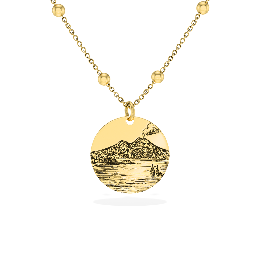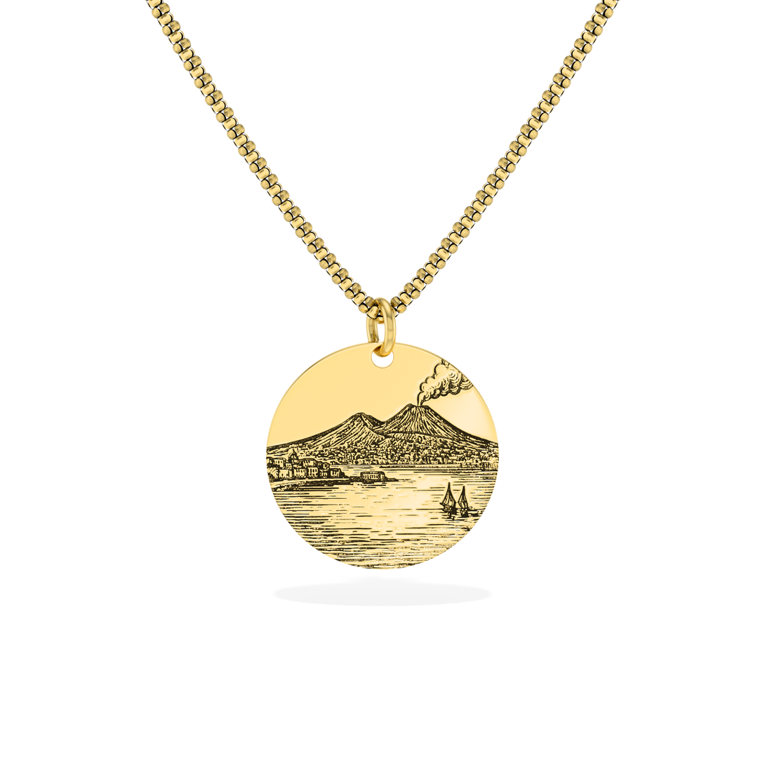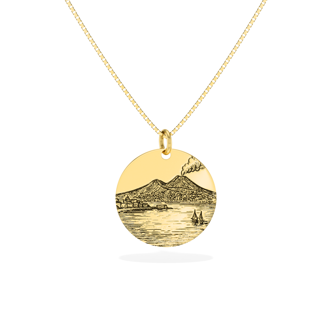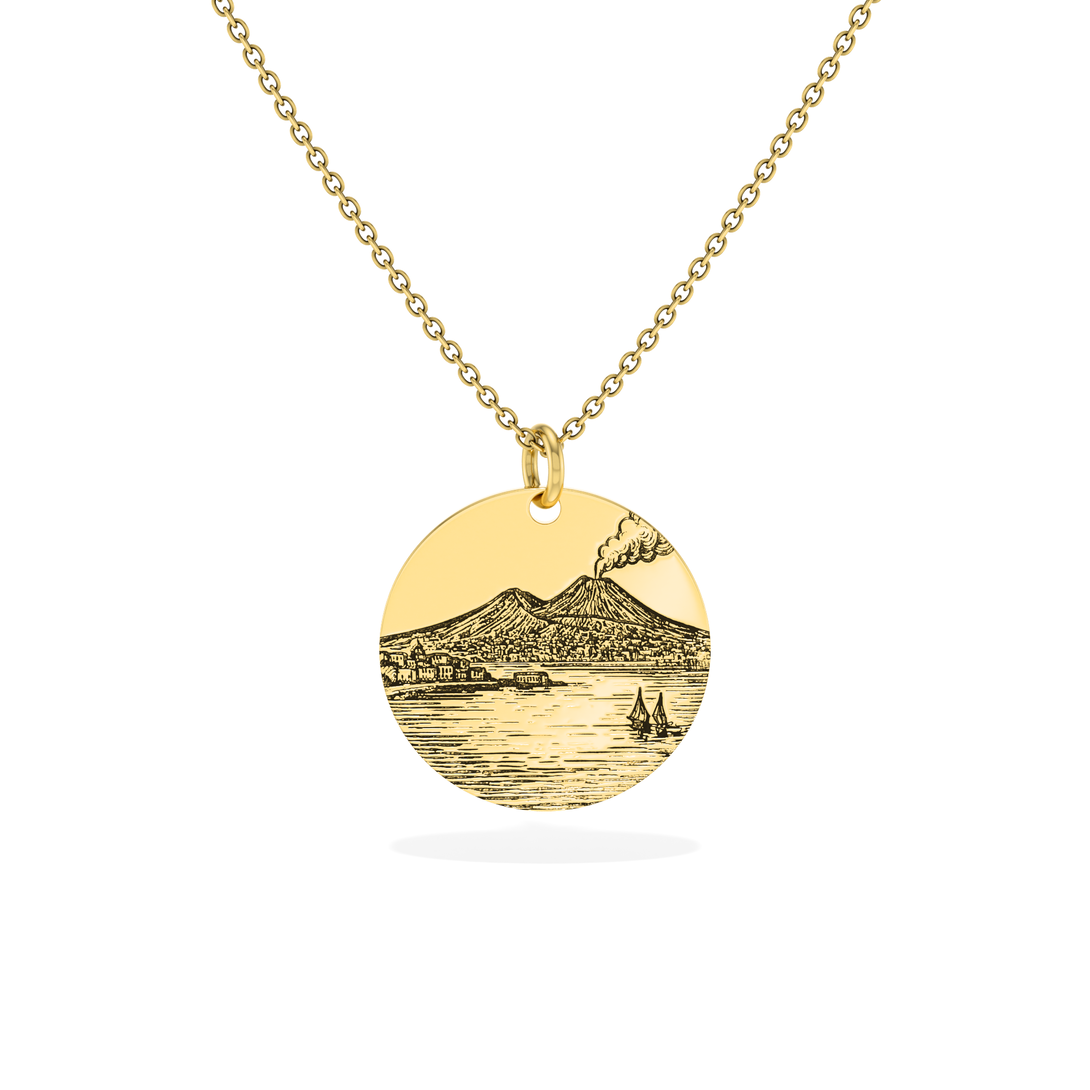 La Collana con Ciondolo Vesuvio e Golfo di Napoli Dorata è un gioiello dal fascino senza tempo, realizzato interamente in Argento 925. Il pendente è un medaglione finemente inciso, che raffigura la suggestiva veduta del Golfo di Napoli con i suoi dettagli iconici. Il disegno è racchiuso da una cornice elegante e armoniosa, che ne esalta la raffinatezza artigianale. Completa di catenina in Argento 925, questa collana è un tributo alla bellezza partenopea, ideale da indossare ogni giorno o da donare come simbolo di legame con una terra ricca di storia e fascino.